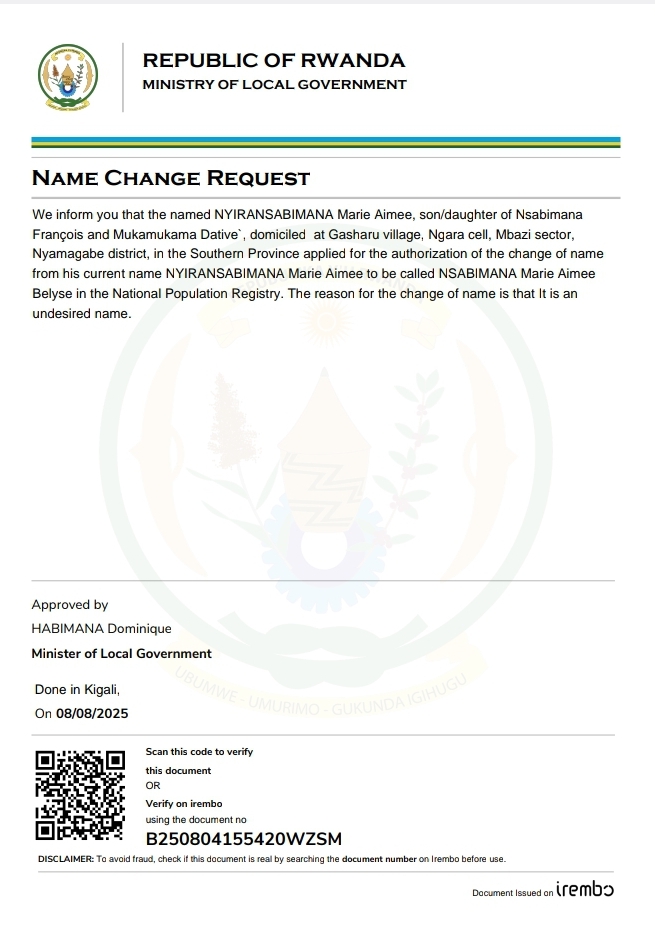 We inform you that the named NYIRANSABIMANA Marie Aimee, son/daughter of Nsabimana François and Mukamukama Dative`, domiciled at Gasharu village, Ngara cell, Mbazi sector, Nyamagabe district, in the Southern Province applied for the authorization of the change of name from his current name NYIRANSABIMANA Marie Aimee to be called NSABIMANA Marie Aimee Belyse in the National Population Registry. The reason for the change of name is that It is an undesired name.