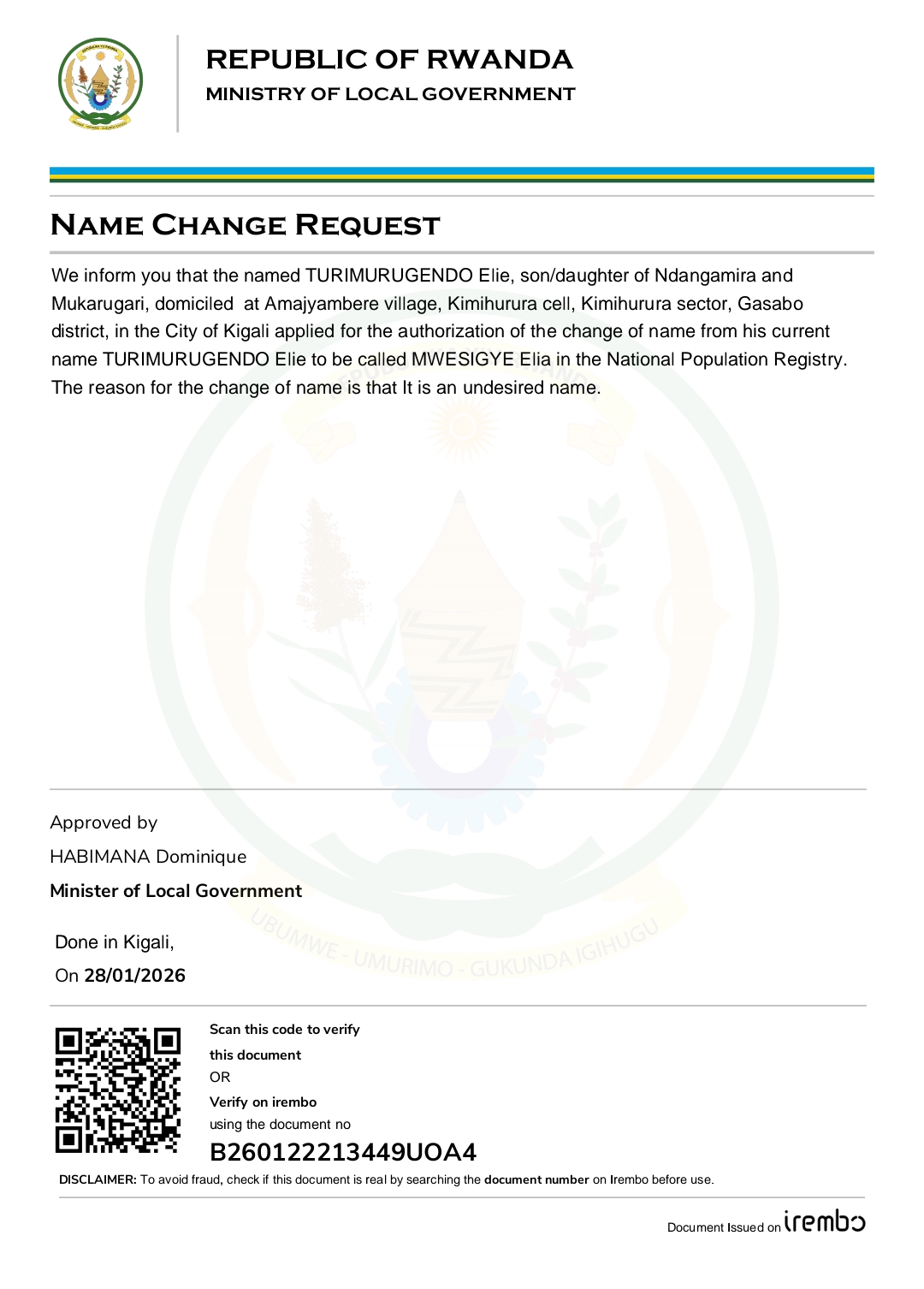AmakuruJustice Itangazo ryo guhinduza amazina By Samuel MUTUNGIREHE - February 10, 2026 0 13 Facebook Twitter Google+ Pinterest WhatsApp