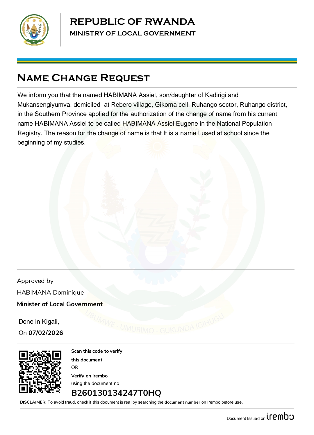 AmakuruJustice Itangazo ryo guhinduza amazina By Samuel MUTUNGIREHE - February 13, 2026 0 9 Facebook Twitter Google+ Pinterest WhatsApp
