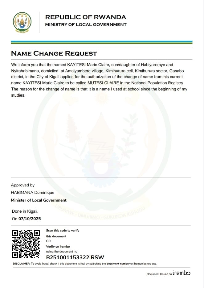 She applied to officially change her name from Kayitesi Marie Claire to Mutesi Claire in the National Population Registry. According to her application, she chose to change the name because “Mutesi Claire” is the name she has used at school since the start of her studies.