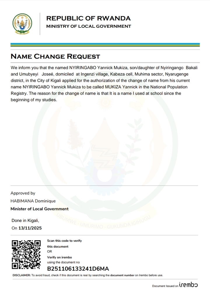 This image displays a formal name change request document issued by the Ministry of Local Government in Rwanda. It confirms that Yannick Mukiza, previously known as Nyiringabo Yannick Mukiza, is authorized to change his name as per the request made to the City of Kigali. The document highlights the significance of this name change, states the reason behind the request, and includes official signatures and references. The request is dated 13/11/2025 and is issued under the authority of the Minister of Local Government.