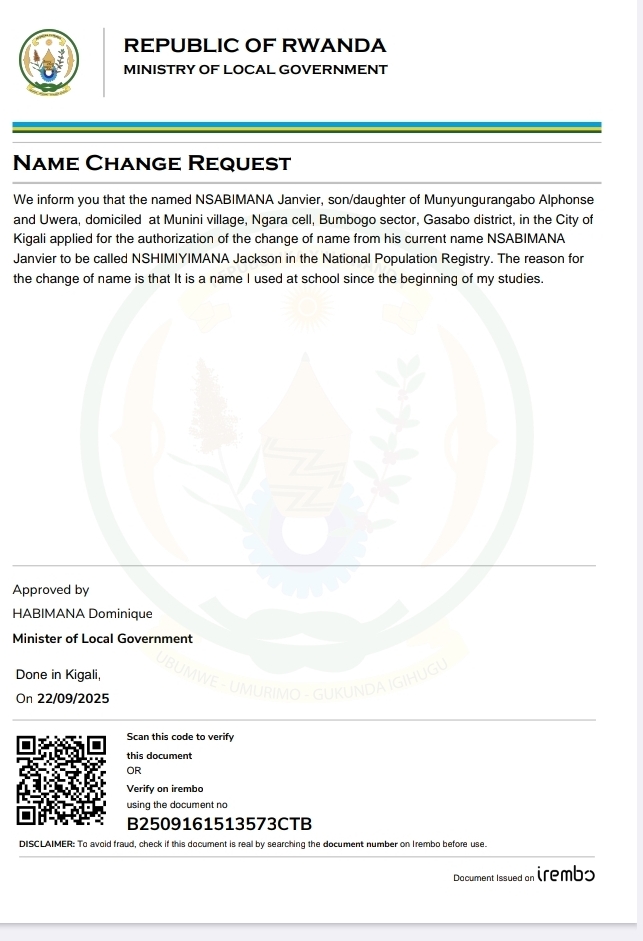 We, the undersigned, hereby request that the name NSABIMANA Janvier, son/daughter of Munyungurangabo Alphonse and Uwera, residing at Munini village, Ngara cell, Bumbogo sector, in the City of Kigali, be changed from his current name NSABIMANA Janvier to be called NSHIMIYIMANA Jackson in the National Population Registry. The reason for this change is that it is the name I used since the beginning of my life.